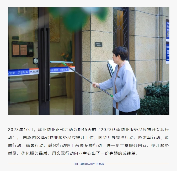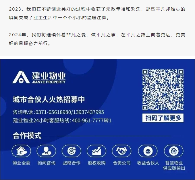 這一年,我們以各條線大比武淬煉一線服務(wù)技能、以系列專項(xiàng)行動持續(xù)提升物業(yè)服務(wù)品質(zhì)、以多樣的幸福時光里活動豐富業(yè)主生活、以強(qiáng)大的綜合實(shí)力贏得多項(xiàng)榮譽(yù)……這一年,建業(yè)物業(yè)人在平凡的崗位上,不斷創(chuàng)造美好,以更好的面貌來迎接建業(yè)物業(yè)的第30年。