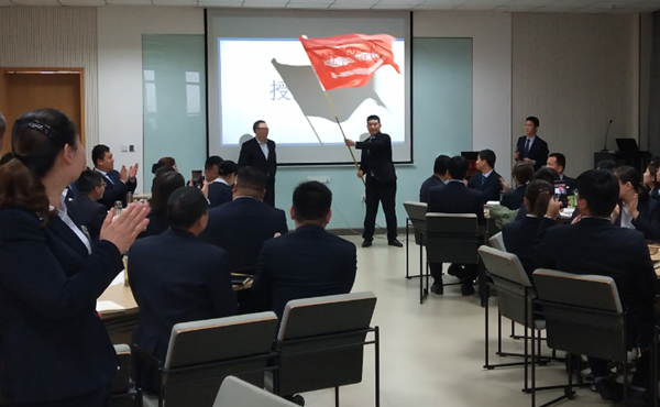 隨后,張總為新項(xiàng)目經(jīng)理團(tuán)隊(duì)授旗,本期培訓(xùn)班班長(zhǎng)巨業(yè)平帶領(lǐng)大家在班旗下宣誓,以表決心。