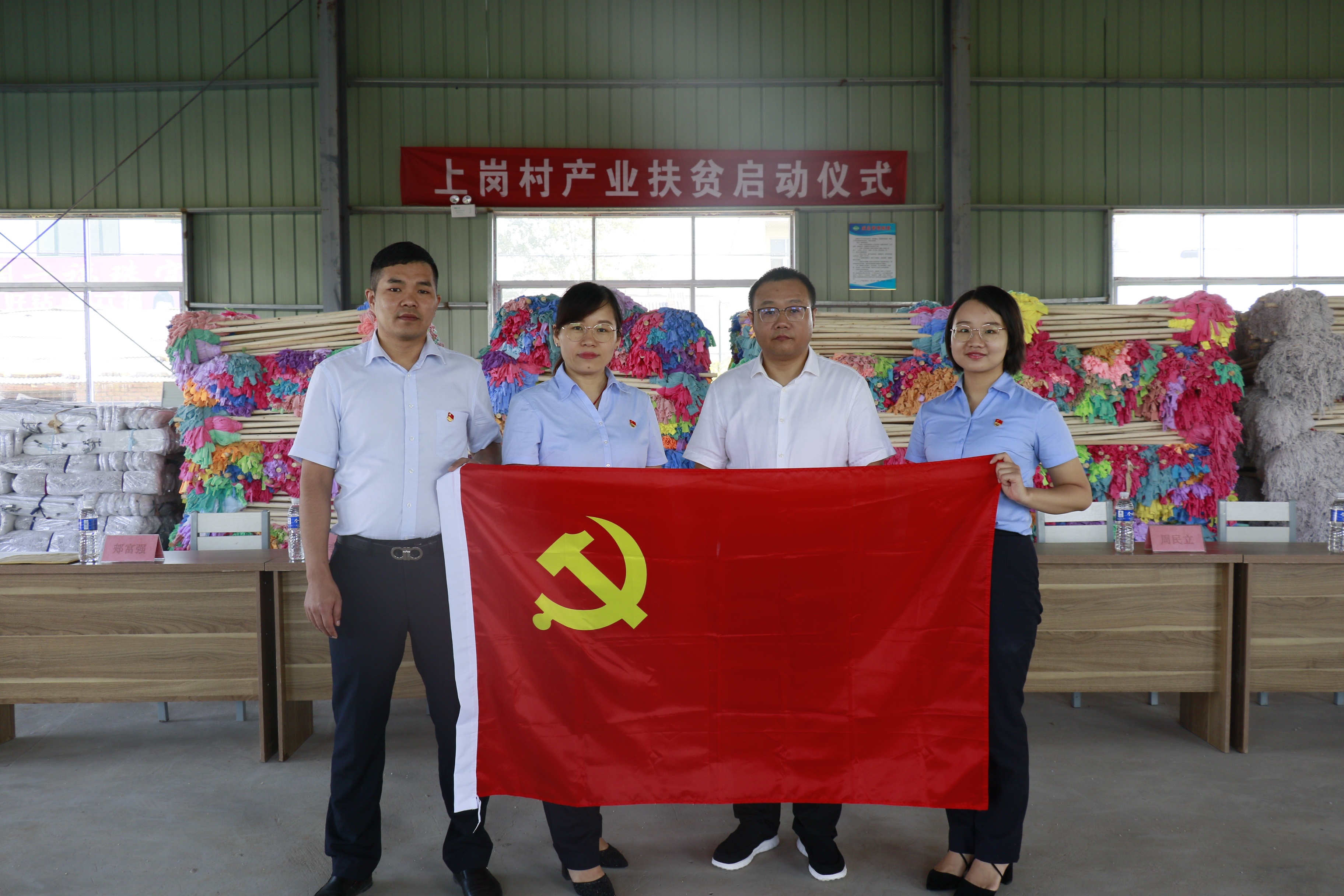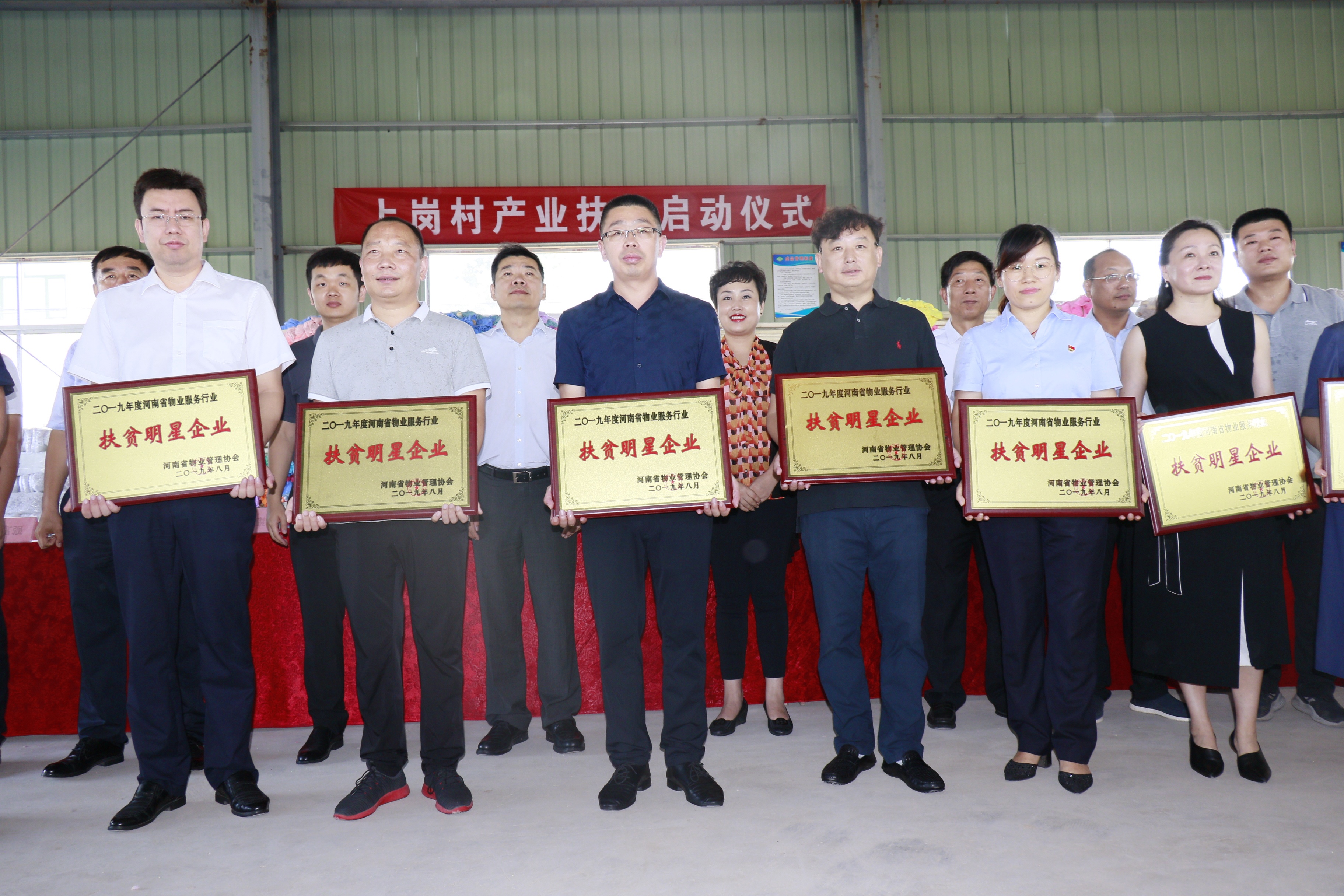 啟動會上,與會領(lǐng)導(dǎo)共同為上崗村拖把廠投入運營進行剪彩,并為以建業(yè)物業(yè)為代表的愛心物業(yè)服務(wù)企業(yè)頒發(fā)“河南省物業(yè)服務(wù)行業(yè)扶貧明星企業(yè)”榮譽獎牌。