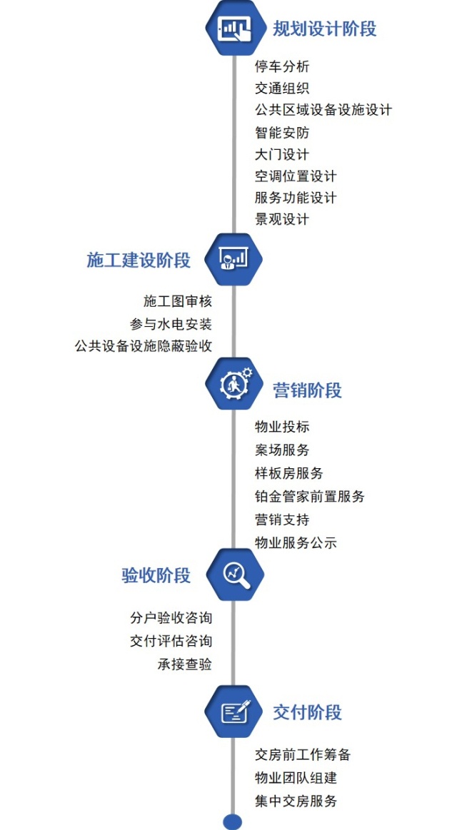 隨著房地產(chǎn)市場(chǎng)的日趨成熟,業(yè)主對(duì)房屋設(shè)計(jì)與物業(yè)管理的品質(zhì)提出了更高的要求。建業(yè)物業(yè)前期介入部參與到項(xiàng)目開發(fā)的全生命周期,圍繞客戶使用、物業(yè)管理及開發(fā)商需求等角度提出合理化建議,力爭(zhēng)將客戶的訴求呈現(xiàn)在設(shè)計(jì)期,將客戶的痛點(diǎn)消滅在交房前,提升客戶對(duì)產(chǎn)品與物業(yè)服務(wù)的滿意度。建業(yè)物業(yè)前期介入服務(wù)分為規(guī)劃設(shè)計(jì)、施工、營(yíng)銷、驗(yàn)收和交付5個(gè)階段,涉及23項(xiàng)重點(diǎn)工作內(nèi)容。