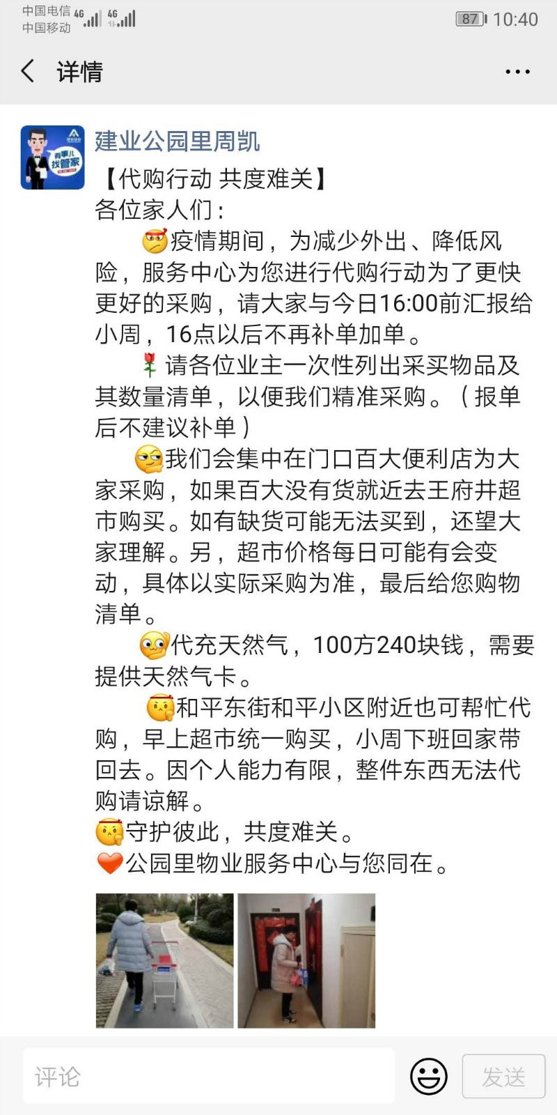 平輿建業(yè)城是一個(gè)剛交房三個(gè)月的新小區(qū),雖然入住率極低,但本著“服務(wù)標(biāo)準(zhǔn)不能低”的準(zhǔn)則,毅然在全市范圍內(nèi)啟動(dòng)了生活物資代購(gòu)服務(wù)。
