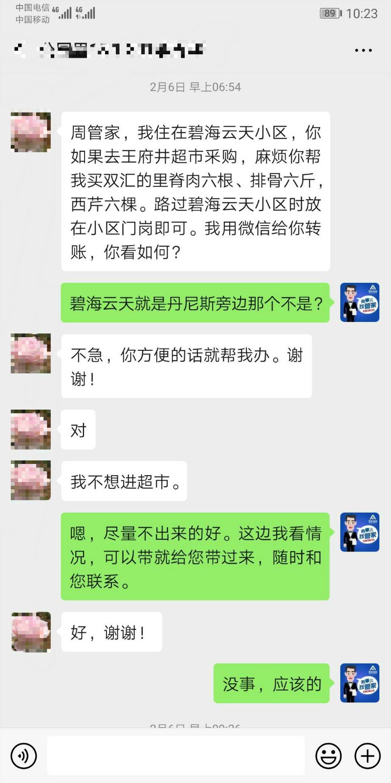 2月6日,焦作公園里貼心管家周凱接到未入住業(yè)主馬女士的代購(gòu)請(qǐng)求。盡管馬女士列的清單里那項(xiàng)5斤雞蛋(小區(qū)門(mén)口便利店受貨量限制,雞蛋是限購(gòu)2斤)讓他為了難,但周凱仍毫不猶豫地答應(yīng)了下來(lái)。