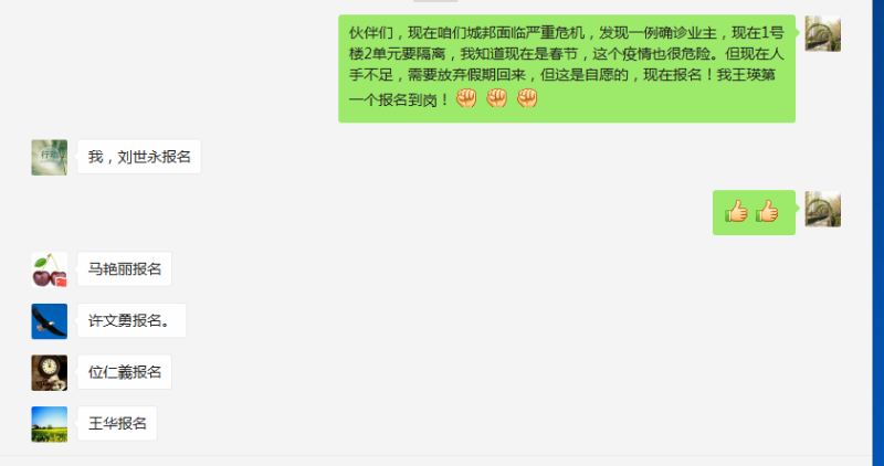 小區(qū)經(jīng)理王瑛則在第一時間趕回崗位全面配合和部署疫情防護(hù)工作。當(dāng)她在員工群中發(fā)布疫情防控進(jìn)展,強調(diào)疫情嚴(yán)重性后,本已調(diào)休在家的貼心管家王棟、魏凱、張城運,安全隊長許文勇、環(huán)境主管王華、維修主管劉世永等人紛紛響應(yīng),主動要求返回崗位。