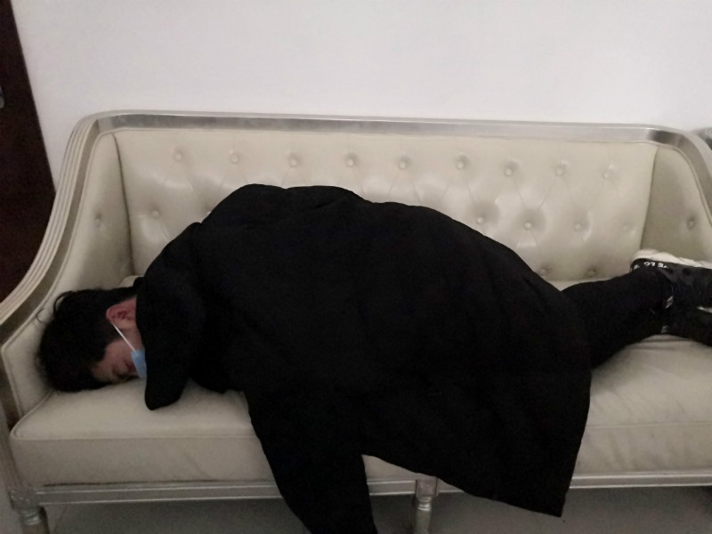 因為疫情,22歲的管家王棟因所租住的小區(qū)安全管控,回不了住處,身高180CM的他蜷著身子在辦公室小沙發(fā)上一睡就是十幾天。他仍樂觀的說:“沒事,正好晚上我在單位值班,小區(qū)有啥事也能顧上”。