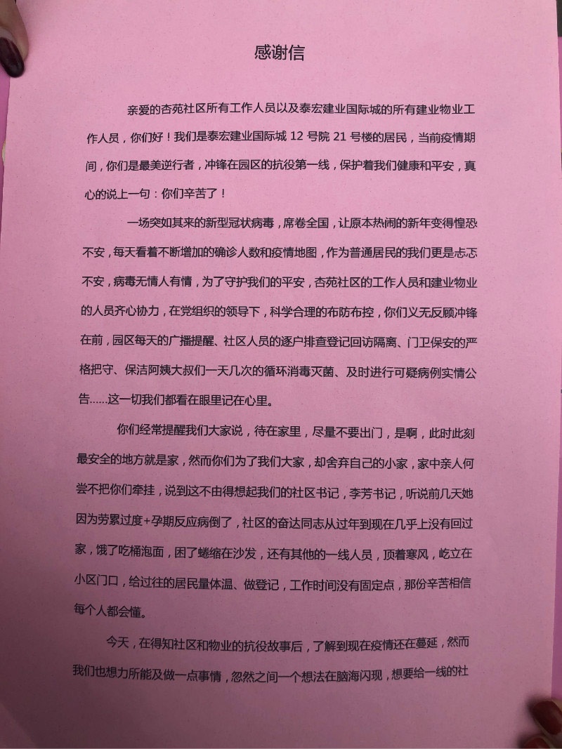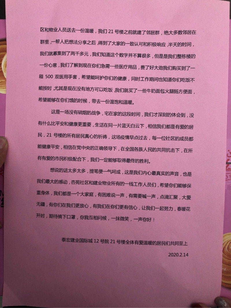 2月14日情人節(jié),鄭州泰宏建業(yè)國際城12號院21號樓的業(yè)主代表,帶著匯聚21號樓89名業(yè)主心意的防疫物資,為建業(yè)物業(yè)和杏花苑社區(qū)送來一篇長達(dá)千字的表白長文。