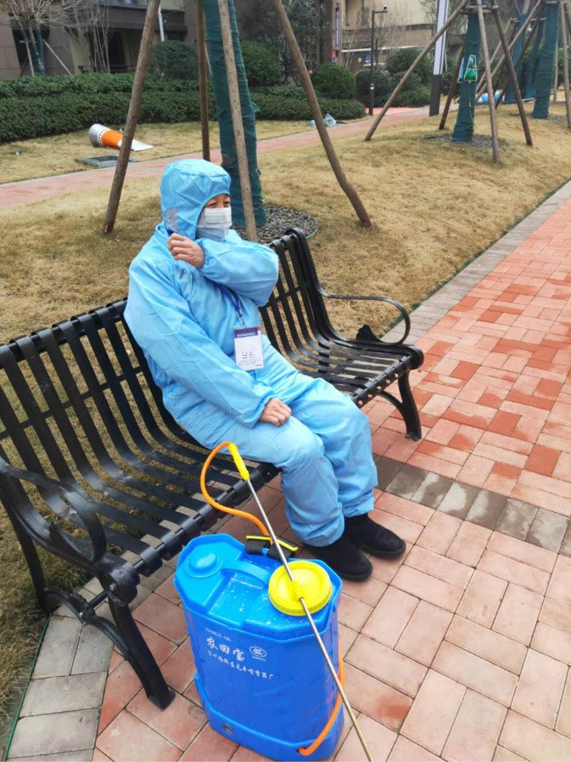 2月8號(hào),已經(jīng)連續(xù)工作11天的李亞偉背著藥桶對(duì)園區(qū)進(jìn)行當(dāng)日的第二遍消殺時(shí),腰痛病發(fā)作,一時(shí)疼得直不起來(lái)。她靠在園區(qū)休閑椅上稍作休息后便又再次投入工作。