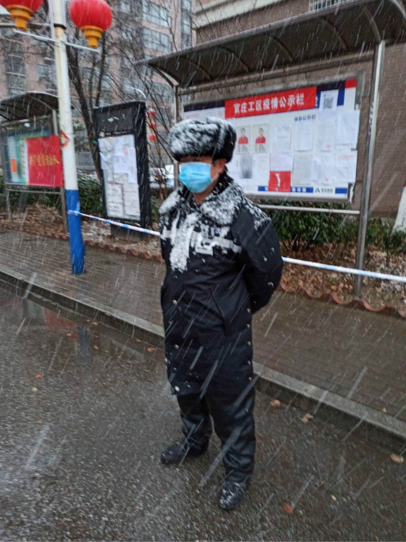 不巧的是,泰山小區(qū)值班室因電路故障無法正常取暖,室外大雪紛飛,室內(nèi)寒氣逼人。但南陽魏崗片區(qū)的禮兵沒有一人因寒冷而離開崗位,他們面迎寒風(fēng),身披雪花,對(duì)出入小區(qū)車輛、人員檢查登記和往常一樣認(rèn)真。他們堅(jiān)定內(nèi)心、堅(jiān)守崗位,將時(shí)刻守護(hù)業(yè)主的責(zé)任牢牢地扛在肩上。