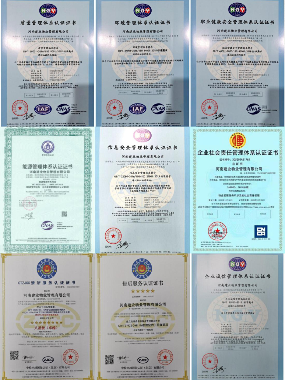 截至2021年1月21日,建業(yè)物業(yè)在原有的質(zhì)量、環(huán)境、職業(yè)健康安全、信息安全、社會責(zé)任、能源管理六標(biāo)認(rèn)證的基礎(chǔ)上,對清潔服務(wù)、售后服務(wù)、企業(yè)誠信管理體系進(jìn)行相關(guān)認(rèn)證工作,并順利取得證書。