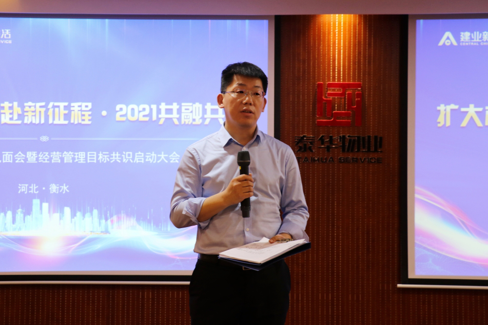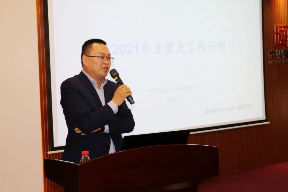 緊接著,泰華錦業(yè)生活常務副總經理李亮亮圍繞泰華錦業(yè)生活2021年度重點工作計劃進行匯報。匯報中,李總明確了泰華錦業(yè)生活未來三年發(fā)展的核心業(yè)績指標,提出“穩(wěn)定主營收入、縱深推進增值服務”的經營策略,“西進北上奔赴京津冀、擴大根據地”的市場發(fā)展戰(zhàn)略,同時圍繞聚焦融合、凝聚團隊、降本提質增效,案場煥新行動、新長征100人才戰(zhàn)略、創(chuàng)新發(fā)展、對標學習、建業(yè)大服務體系體驗、行業(yè)課題研究以及紅色物業(yè)城市運營商等內容進行匯報。