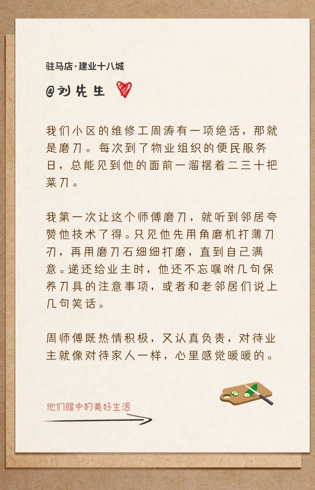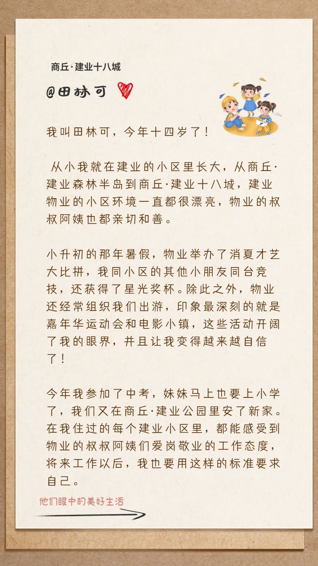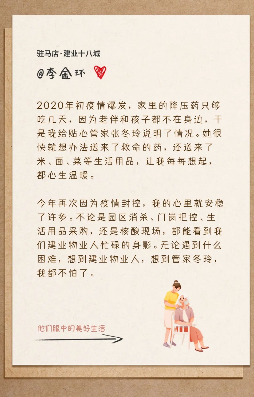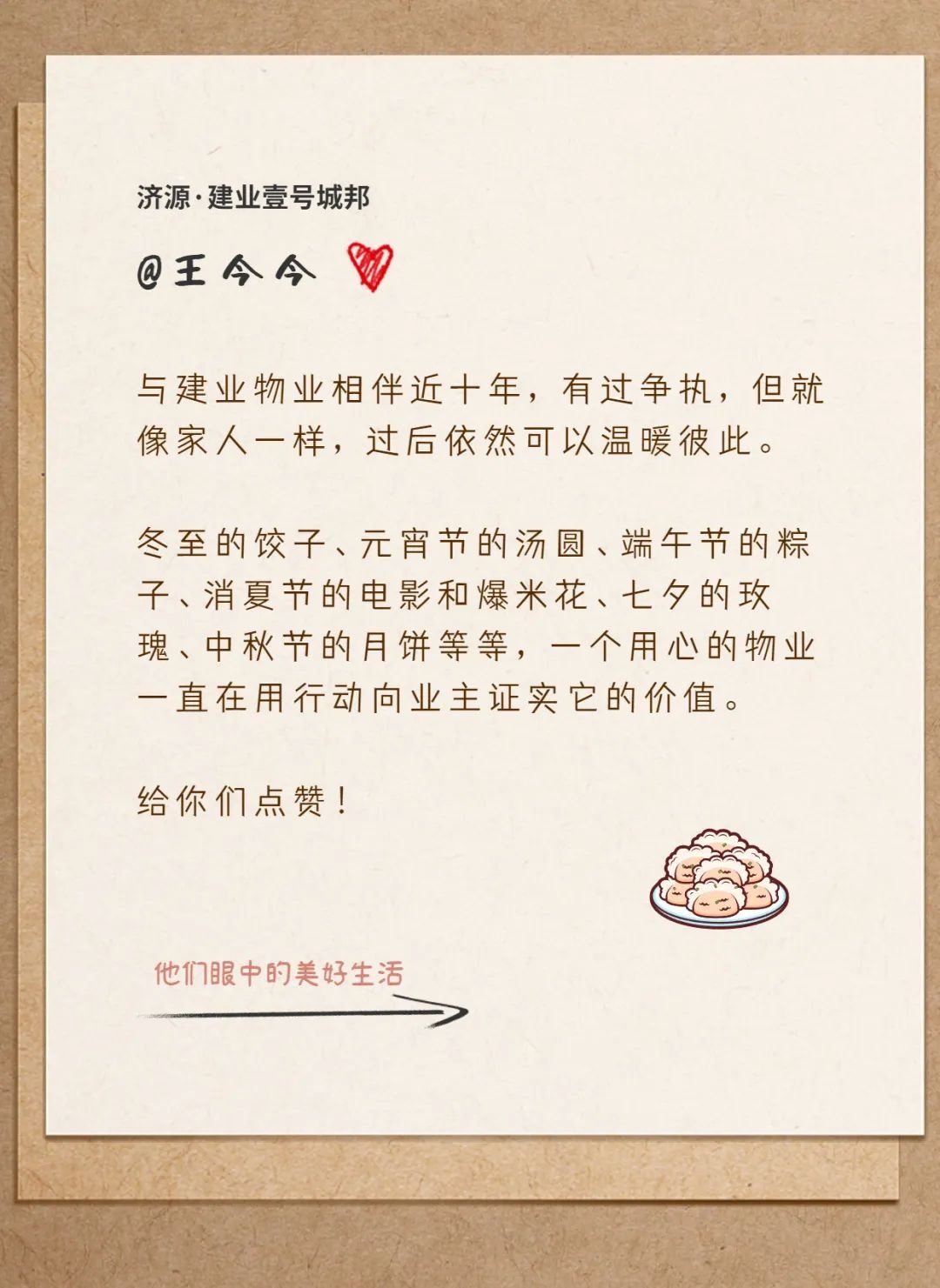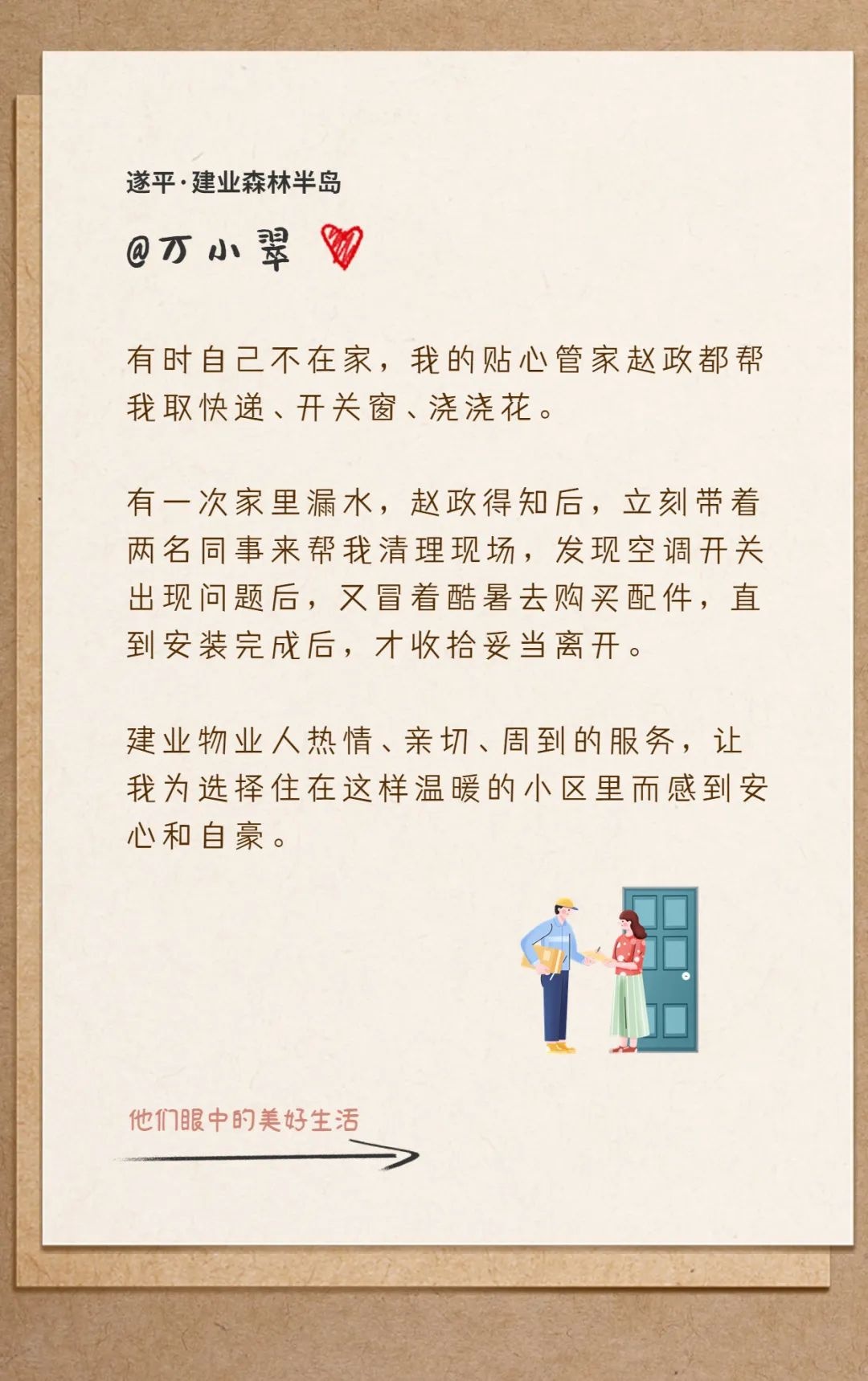 建業(yè)物業(yè)竭力為業(yè)主制造一份份美好,而業(yè)主們也在用真摯懇切的情感和樸實(shí)有力的文字,一字一句地記錄著建業(yè)物業(yè)人的付出,表達(dá)著自己內(nèi)心的感動和認(rèn)可。