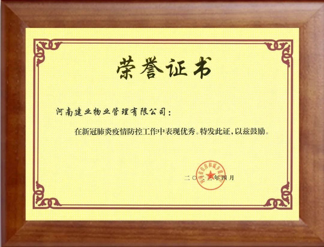 近日,因在過(guò)去三年的新冠肺炎疫情防控工作中表現(xiàn)優(yōu)秀且作出突出貢獻(xiàn),建業(yè)物業(yè)獲得由河南省住房和城鄉(xiāng)建設(shè)廳頒發(fā)的榮譽(yù)證書。
