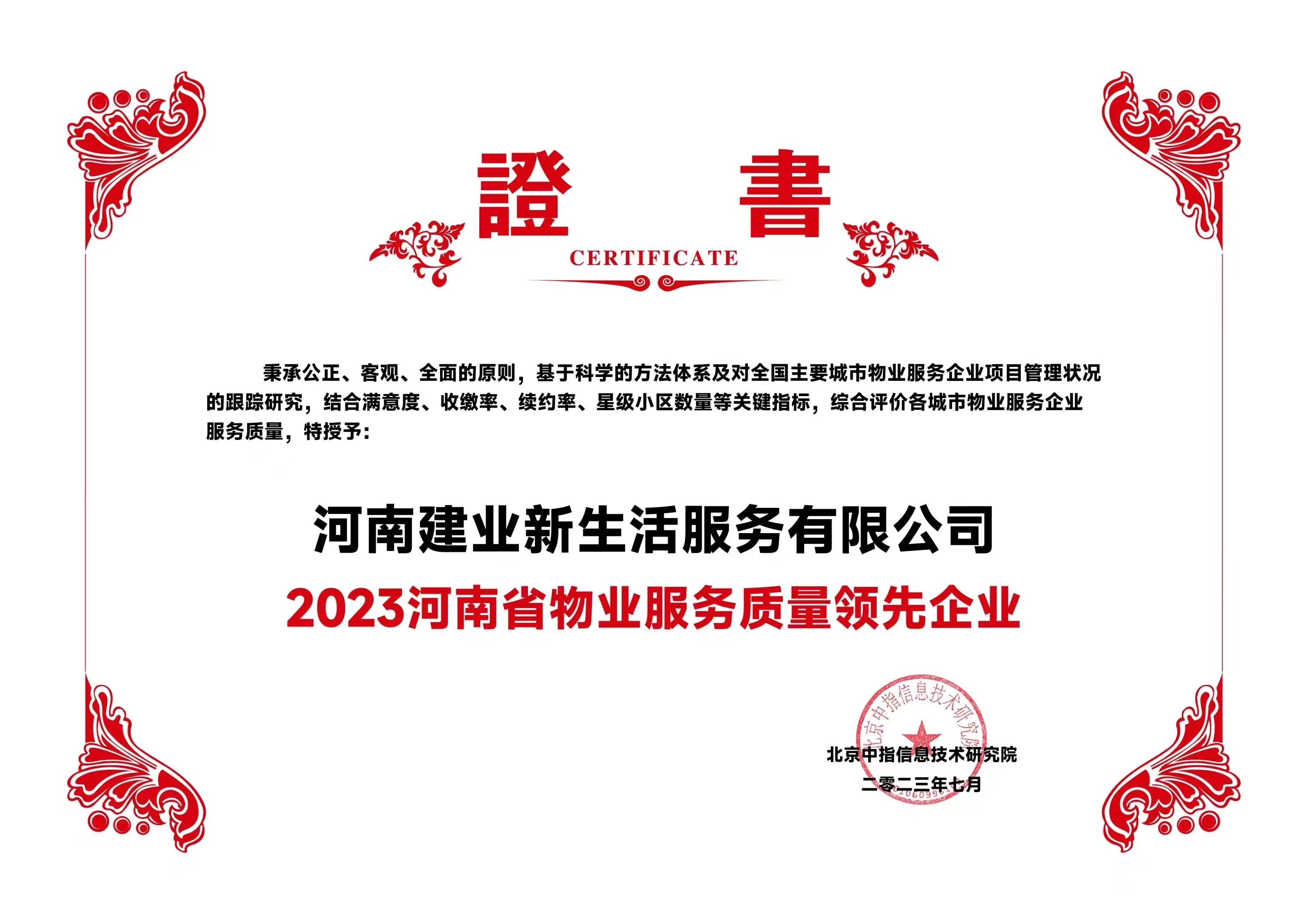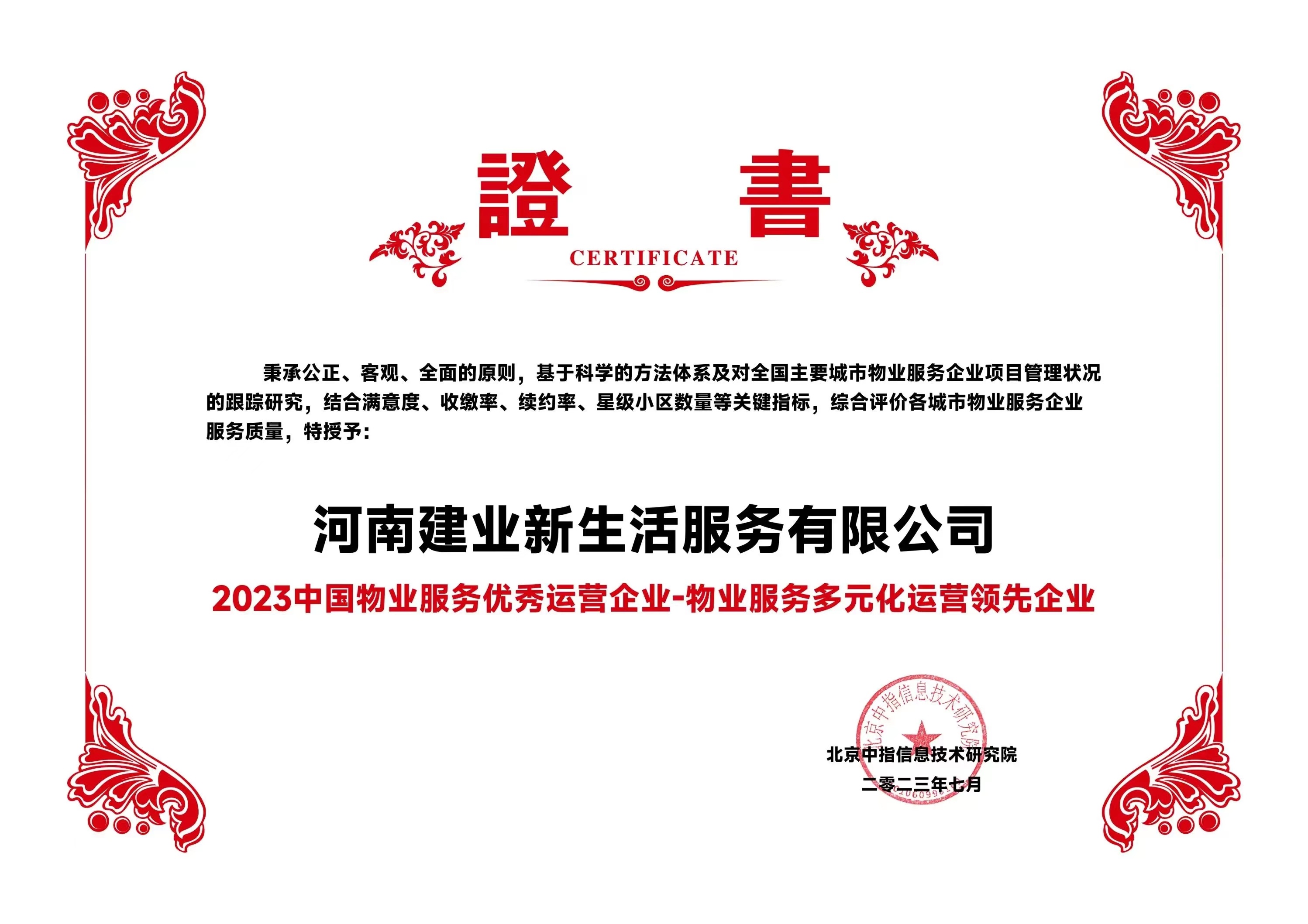 7月6日,在由北京中指信息研究院主辦的中房指數(shù)2023房產(chǎn)市場趨勢報告會上,建業(yè)新生活憑借卓越的運營能力和專業(yè)的服務(wù)水平,榮獲“2023 物業(yè)服務(wù)優(yōu)秀運營企業(yè)-物業(yè)服務(wù)多元化運營優(yōu)秀企業(yè)”“2023 河南省服務(wù)質(zhì)量領(lǐng)先企業(yè)”“2023鄭州市服務(wù)質(zhì)量領(lǐng)先企業(yè)”三項殊榮。