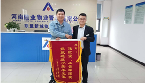 六月,艷陽如火,蟬鳴如潮。建業(yè)物業(yè)人滿懷如火的熱情,用服務(wù)為業(yè)主送來絲絲舒暢。六月份全省在管小區(qū)涌現(xiàn)出好人好事共計284例,其中收到錦旗65面,表揚信127封,來電感謝及其他92例。 鏡頭一: 6月2日9時許,平頂山·十八城貼心管家王明濤接到7號樓尹女士的緊急電話,稱自己的丈夫腿受傷已無法動彈,等不及救護車過來了。王明濤和禮兵中隊長白洋洋、巡邏禮兵安東火速趕到業(yè)主家中,一邊保護王先生腿部不再受到二度傷害,一邊將王先生背下樓并送往醫(yī)院。因就診及時,病人病情得到及時控制,并無大礙。 次日,尹女士特地讓孩子代表夫婦二人送來一面印有“智慧果敢加神速,為業(yè)主排憂解難”字樣的錦旗,以此表達對建業(yè)物業(yè)的感激之情。 鏡頭二